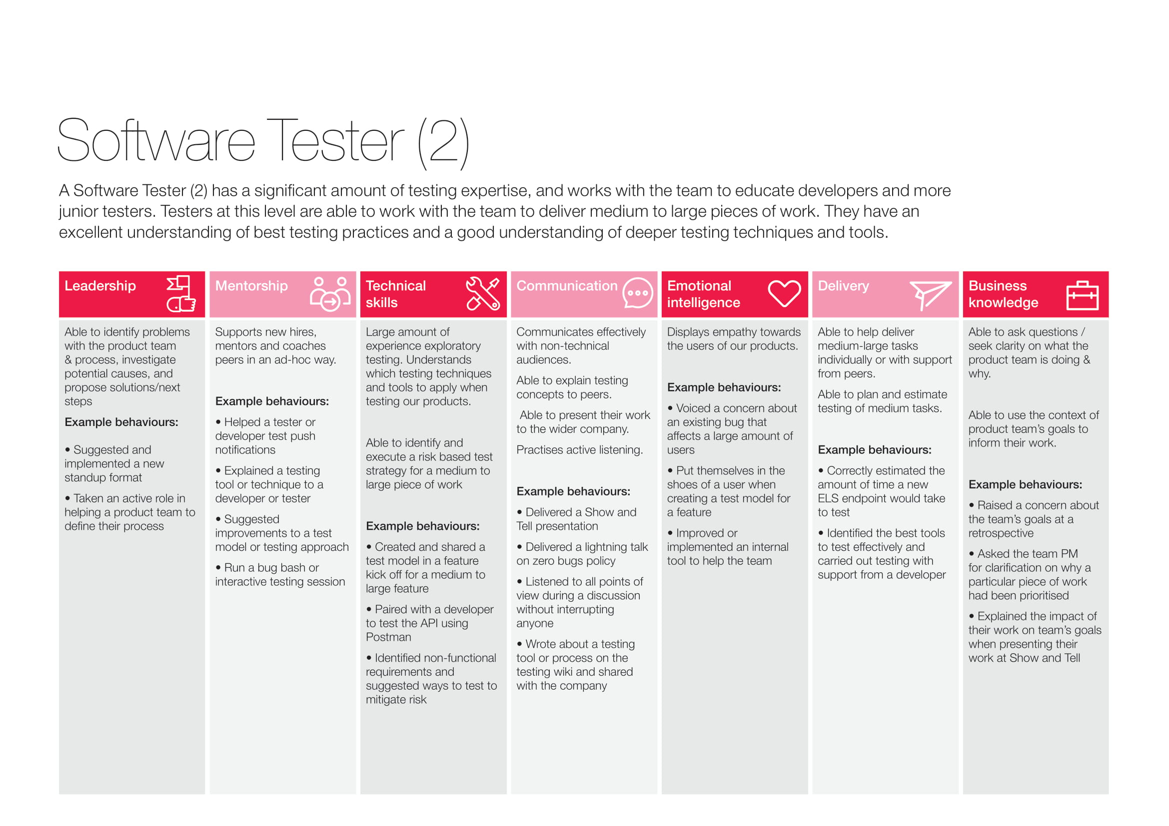 Business Knowledge,Emotional Intelligence,Communication,Delivery (Testing),Leadership,Mentorship,Technical Skill (Testing)