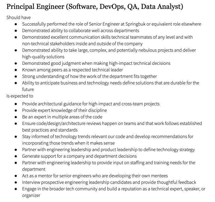To be eligible for Principal Engineer (Software, DevOps, QA, Data Analyst), you must meet all of the following: