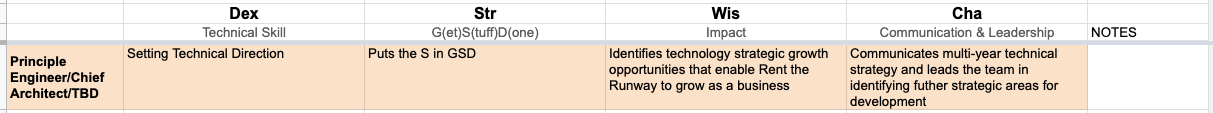 Cha (Communication & Leadership): Team Management,Cha (Communication & Leadership): Mentoring,Cha (Communication & Leadership): Collaboration,Wis (Impact),Str (G[et] S[tuff] D[one]),Dex (Technical Skill): Building